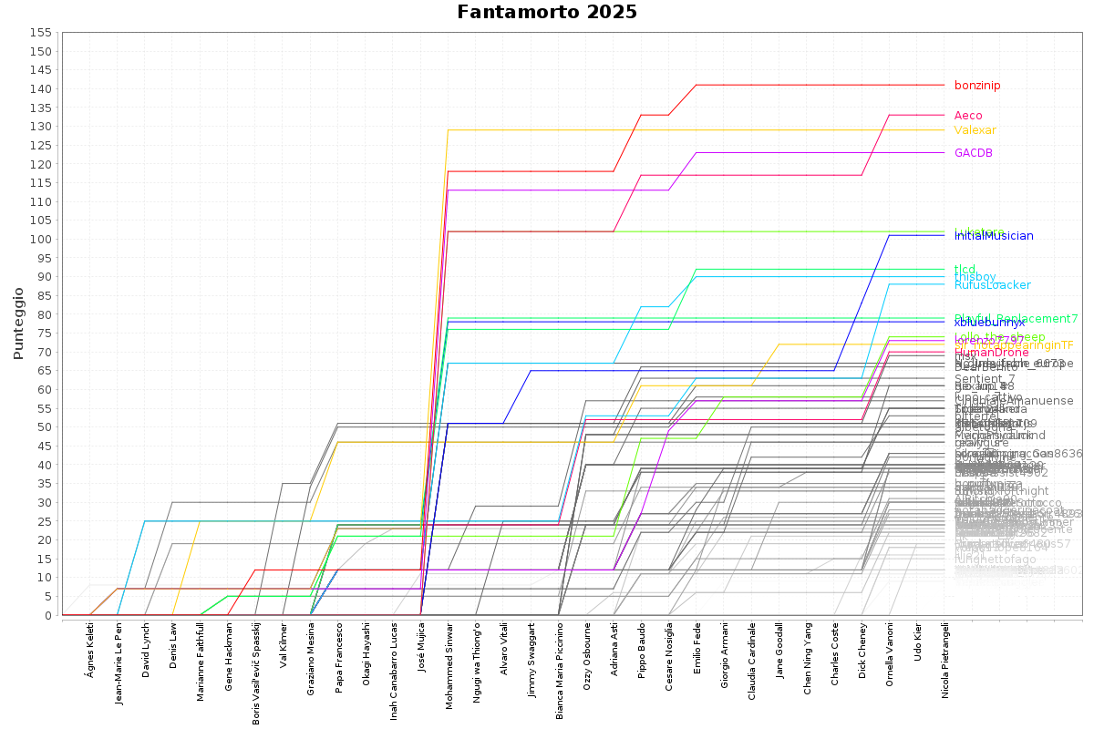 +51 - MORTO (Mohammed Sinwar, età: 49) +51 - CAPITANO (Mohammed Sinwar, età: 49) +12 - MORTO (Papa Francesco, età: 88) +4 - MORTO (Jean-Marie Le Pen, età: 96) +3 - SPEEDY GONZALES (Jean-Marie Le Pen) +4 - GLOBETROTTER (Argentina, Stato di Palestina, Francia) +4 - JACK OF ALL TRADES (sacerdote cattolico di rito latino, condottiero, politico) 129 |